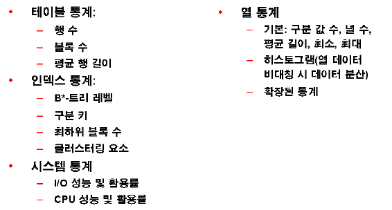 옵티마이저가 최적의 실행계획을 생성할 수 있도록 제공해주는 테이블(객체) 및 시스템 분석정보